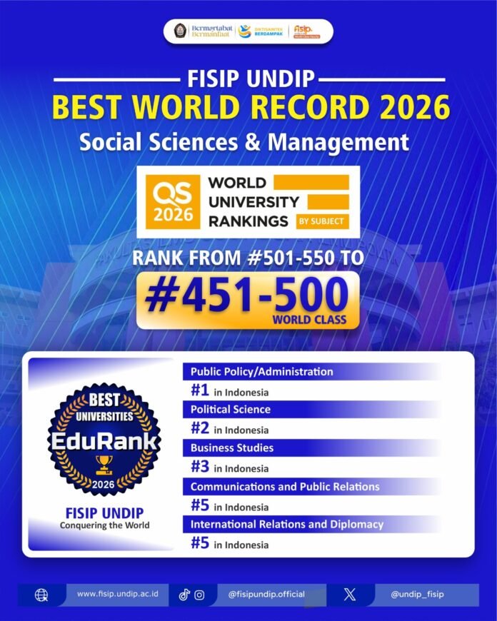 JATENGPOS.CO.ID SEMARANG – Fakultas Ilmu Sosial dan Ilmu Politik Universitas Diponegoro (FISIP Undip) membuka tahun 2026 dengan capaian yang membanggakan. FISIP Undip resmi meraih peringkat 451-500 dunia pada QS World University Rankings by Subject 2026 untuk rumpun Social Sciences & Management.