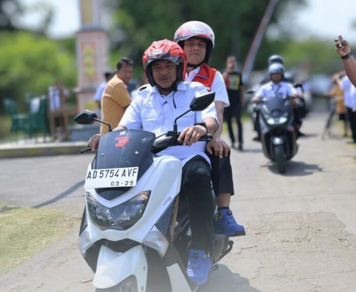 JATENGPOS.CO.ID, KARANGANYAR – Ada yang menarik saat kunjungan kerja Gubernur Jawa Tengah, Ahmad Luthfi, di Kabupaten Karanganyar. Aksi nyata kampanye hemat energi dan pengurangan emisi karbon dilakukan Bupati Karanganyar, Rober Christanto dengan cara mengajak Gubernur Ahmad Luthfi berbocengan menggunakan sepeda motor saat melakukan tinjauan lapangan, Rabu (08/04).