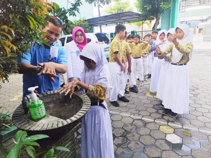 Direktur RS PKU Muhammadiyah Sukoharjo, dr. Resita, memberikan edukasi langsung mengenai teknik cuci tangan yang efektif menggunakan metode cepat yang mudah diingat anak-anak, yakni “Tepung Selaci Puput”.